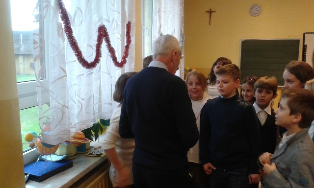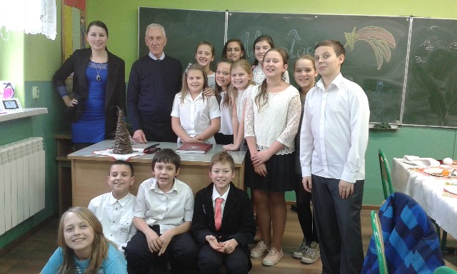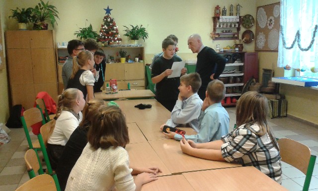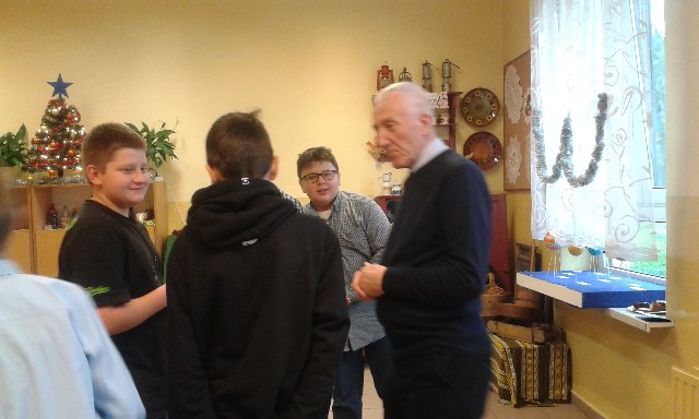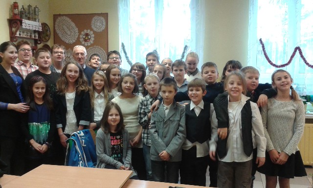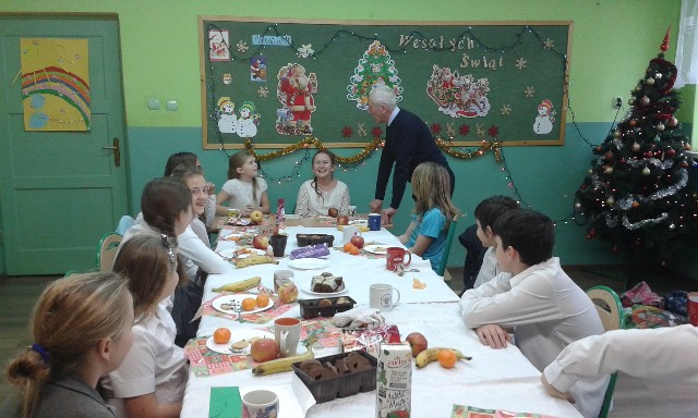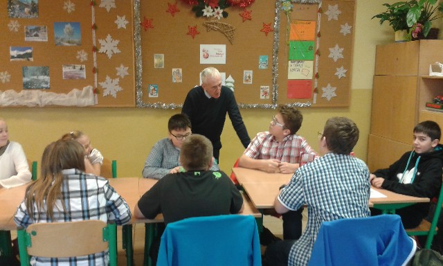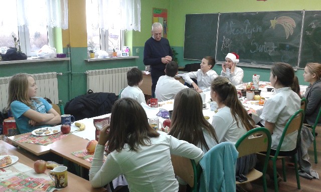 Dnia 19.12.2014 w klasach V i VI odbyły się lekcje języka angielskiego z mieszkańcem Wielkiej Brytanii panem Edwardem Thompsonem. Dzięki inicjatywie nauczyciela języka angielskiego pani Katarzyny Szczerbowskiej dzieci miały niepowtarzalną okazję do sprawdzenia swoich umiejętności językowych. Uczniowie nie tylko odpowiadali na pytania pana Thompsona, ale również chętnie zadawali je samodzielnie. Pytania dotyczyły zainteresowań, nawyków żywieniowych, ulubionych przedmiotów, angielskich i polskich zwyczajów świątecznych. W razie potrzeby uczniowie korzystali z pomocy nauczyciela i kolegów w celu zrozumienia wszystkich informacji.