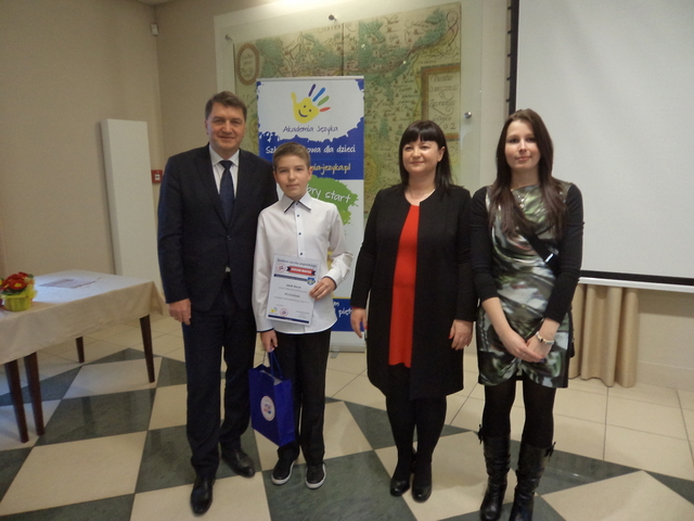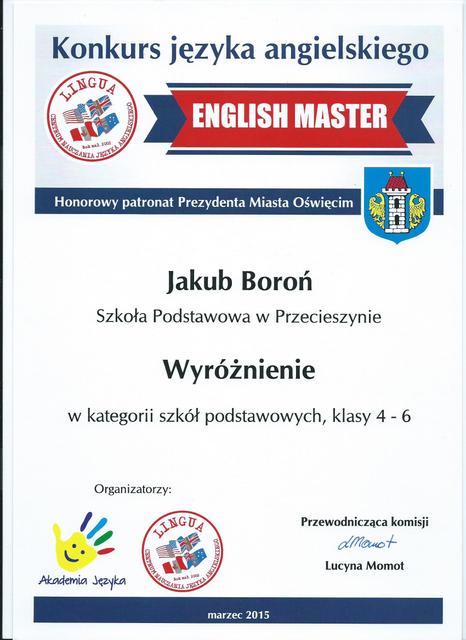 Mamy zaszczyt poinformować, że w pierwszej edycji Konkursu „English Master” uczeń klasy szóstej – Jakub Boroń zdobył wyróżnienie. Serdecznie gratulujemy uzyskania wysokiego wyniku. Poniżej, zamieszczamy zdjęcia z uroczystej gali wręczenia nagród w Muzeum Zamek Oświęcim.