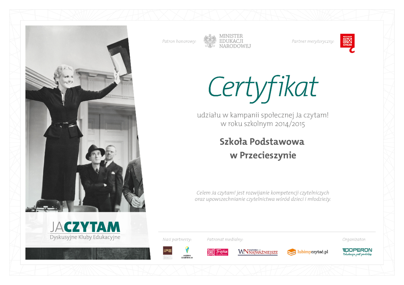 Certyfikat udziału w kampanii społecznej "Ja czytam!" w roku szkolnym 2014/2015
