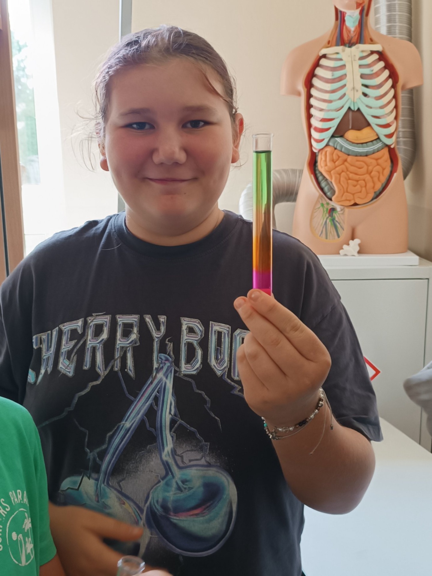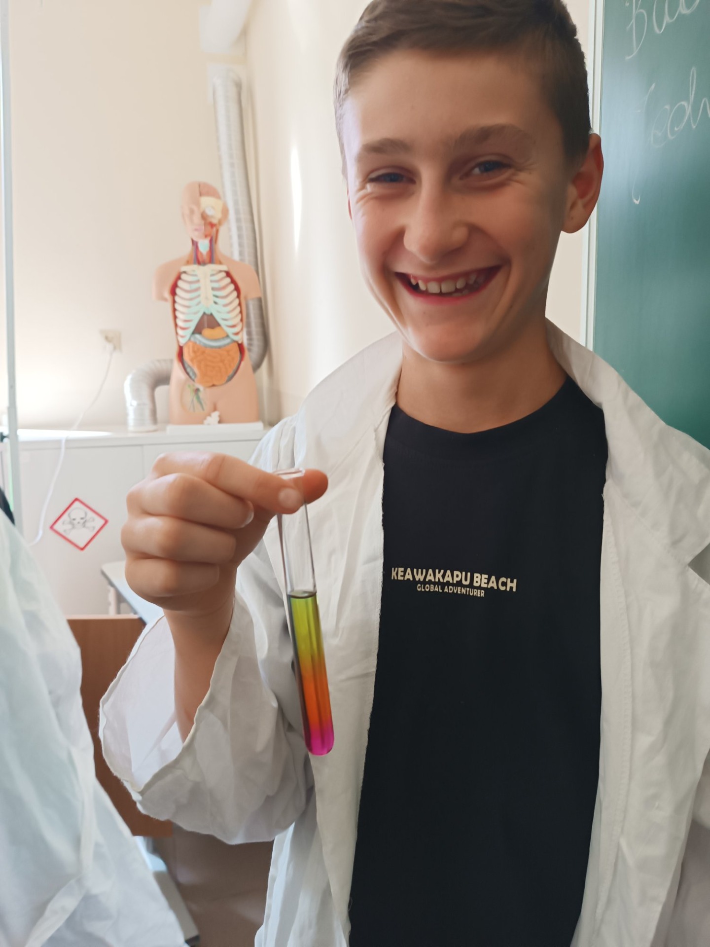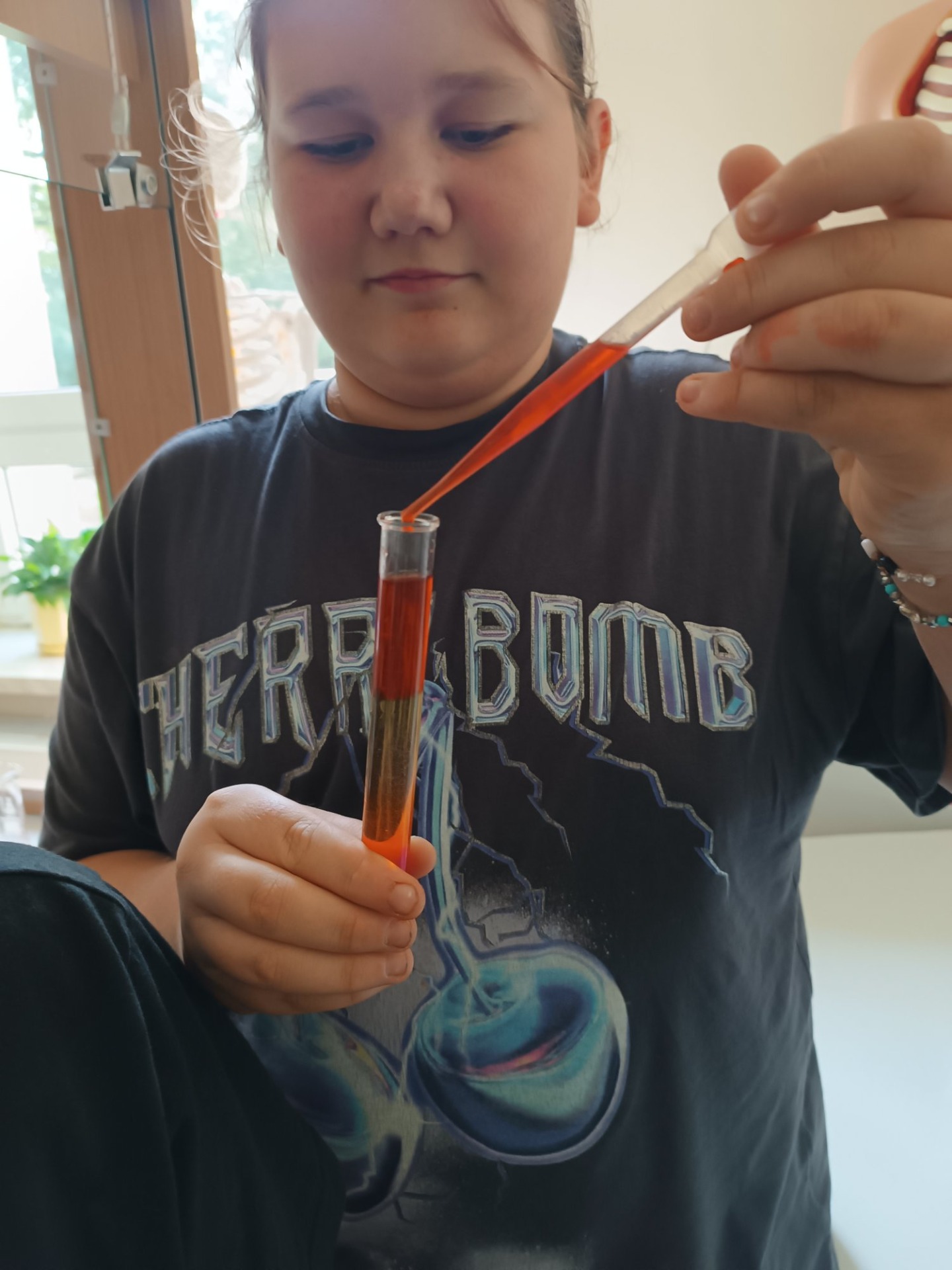 Na lekcji chemii uczniowie klasy VII mieli okazję w praktyce sprawdzić, czym jest gęstość i jak wpływa ona na zachowanie substancji. Aby to zrozumieć, przeprowadziliśmy prosty, a zarazem efektowny eksperyment – stworzyliśmy barwną probówkę.