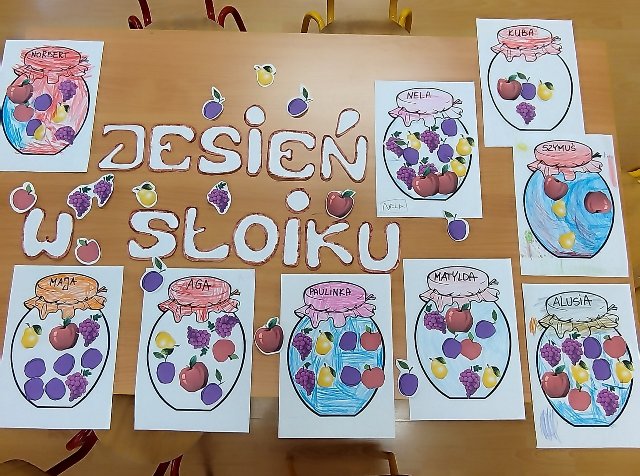 Podczas zajęć plastycznych grupa starsza wykonała pracę "Jesień w słoiku". Było to ćwiczenie rozwijające pomysłowość, zdolności manualne dzieci i utrwalające wiadomości o jesieni.