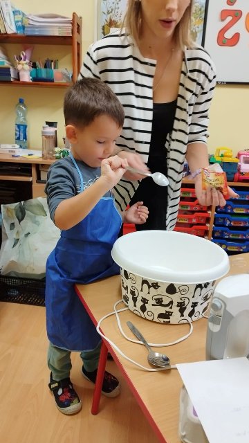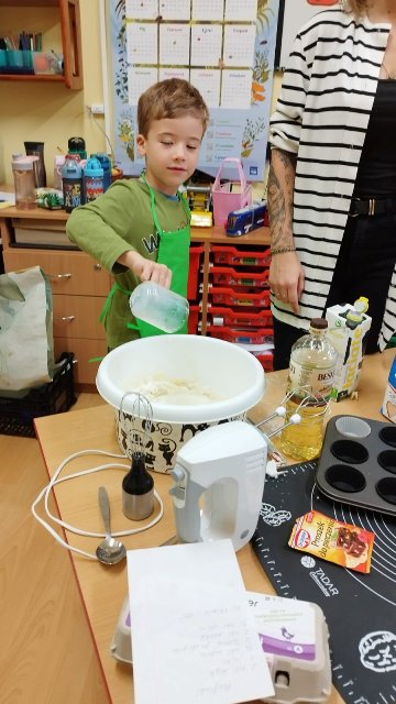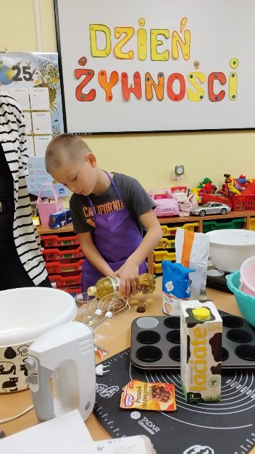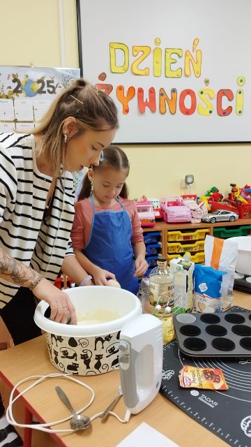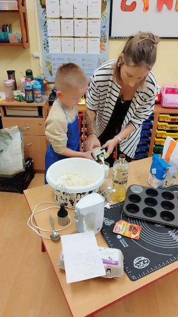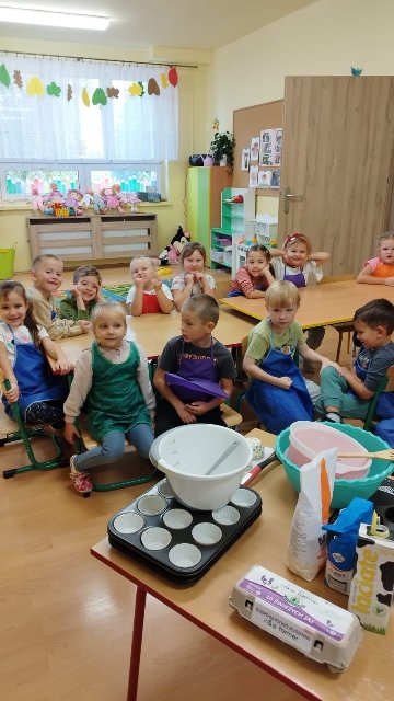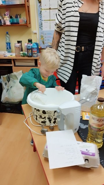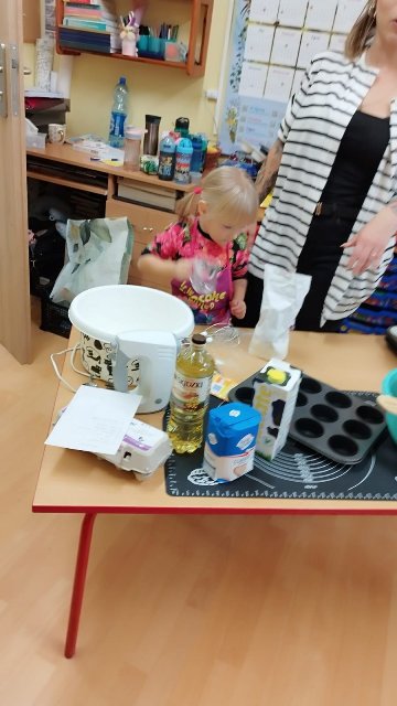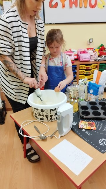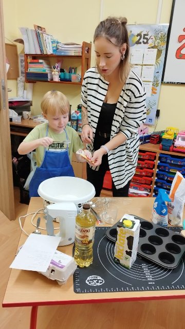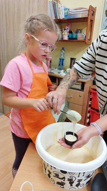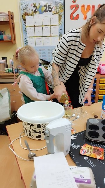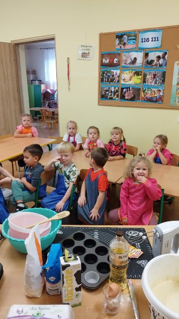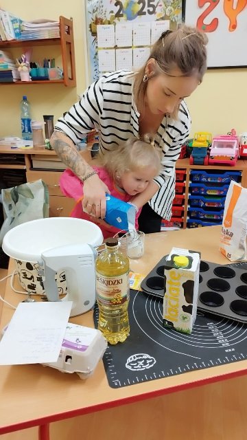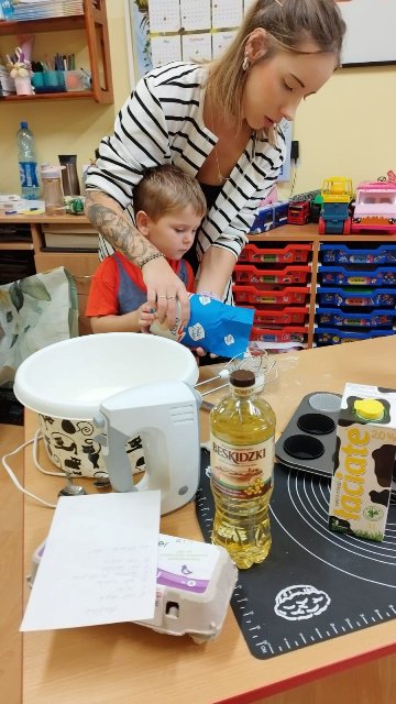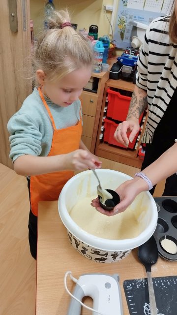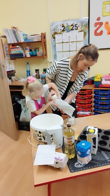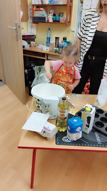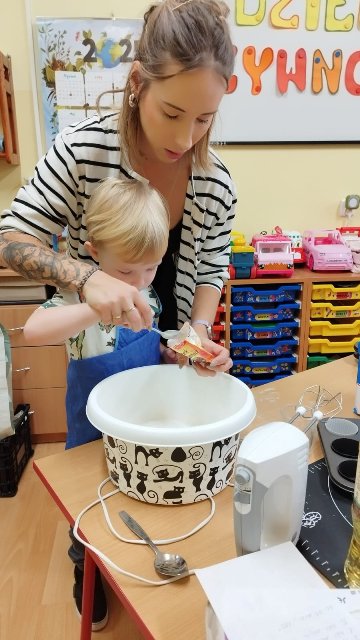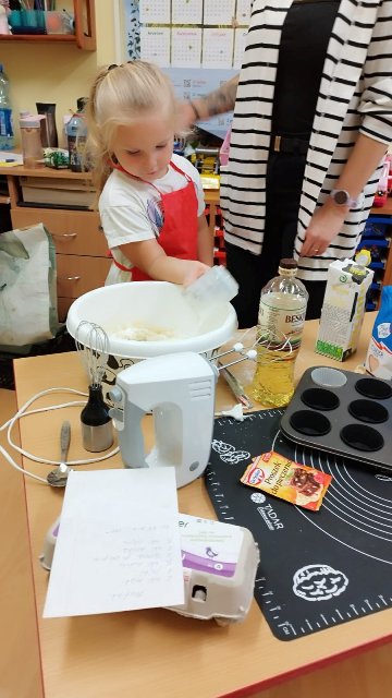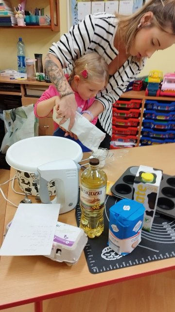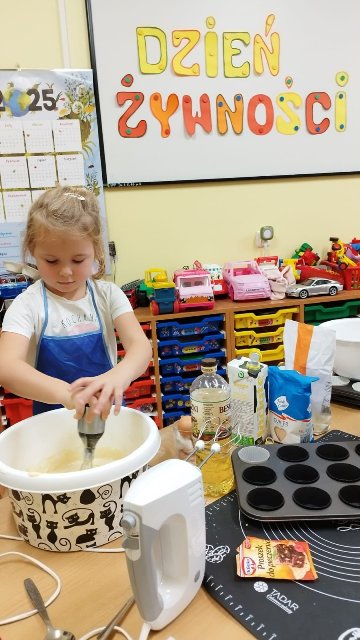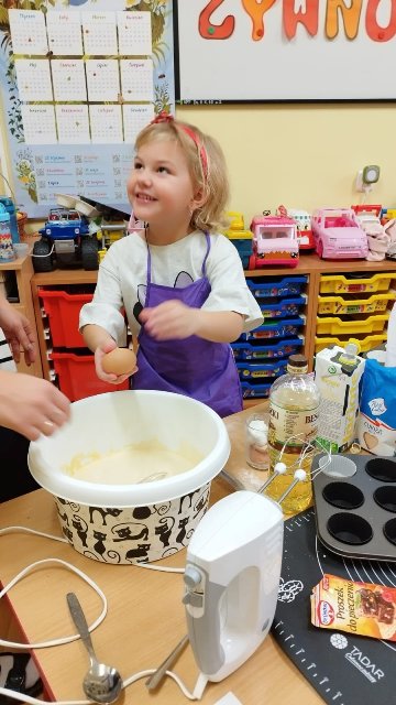 W naszym przedszkolu staramy się uczyć dzieci samodzielności oraz zachęcamy do pomagania rodzicom w domu. Tym razem, z okazji Dnia Żywności, postawiłyśmy na babeczki. Dzieci wrzucały do miski składniki, mieszały powstałą masę, a także przelewały ciasto do foremek. Niektóre starszaki potrafiły nawet samodzielnie wbić jajko! Było zabawnie i baaaardzo smacznie. Na koniec dnia każde dziecko zabierało do domu zrobioną babeczkę.