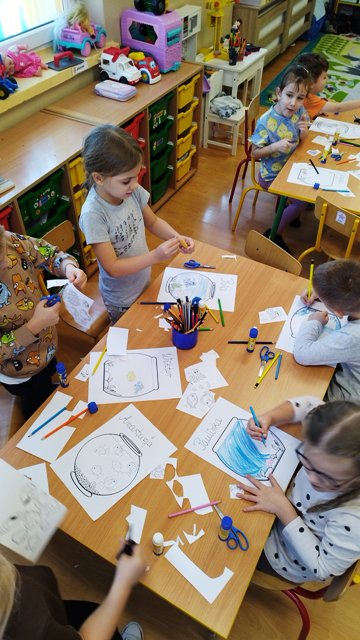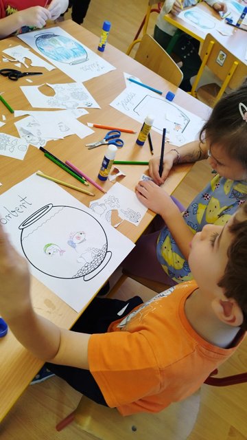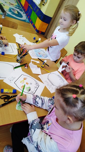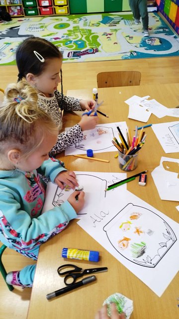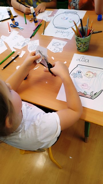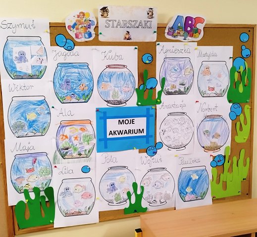 Z okazji tygodnia ze zwierzątkami grupa starsza wykonała pracę plastyczną „Moje akwarium". Dzieci ćwiczyły wycinanie nożyczkami, projektowały życie w akwarium i realizowały swoje zamierzenia.