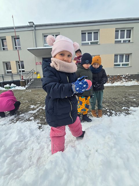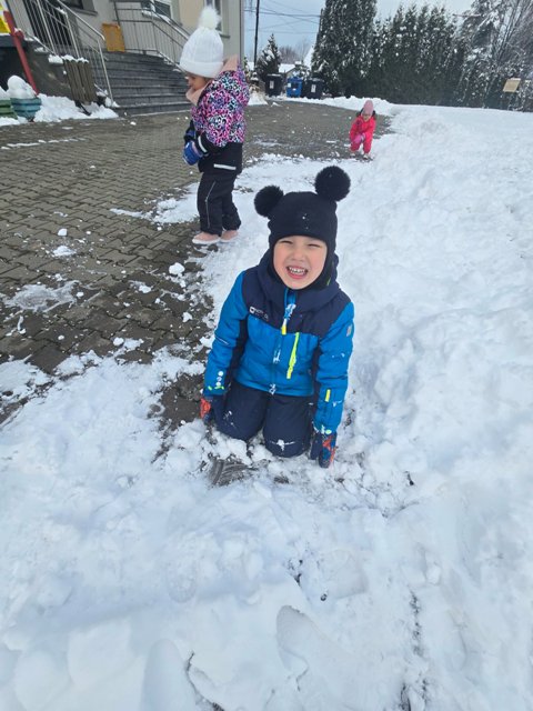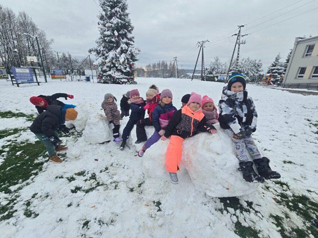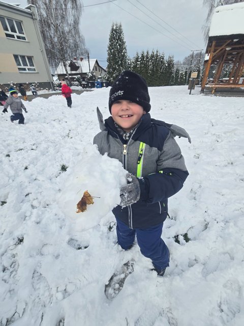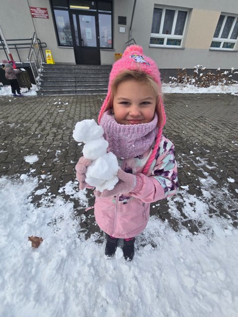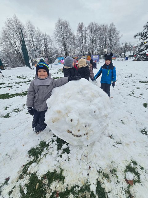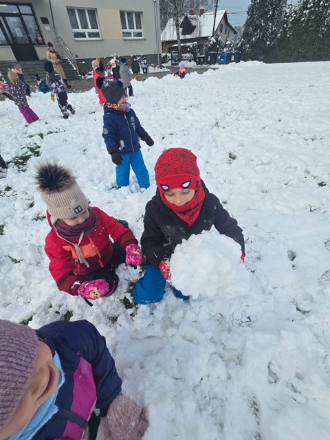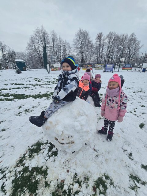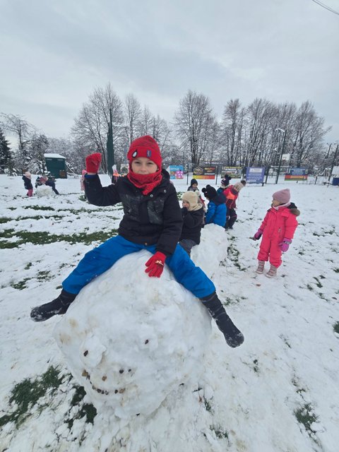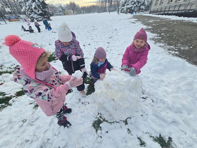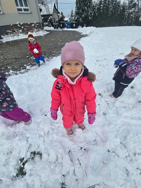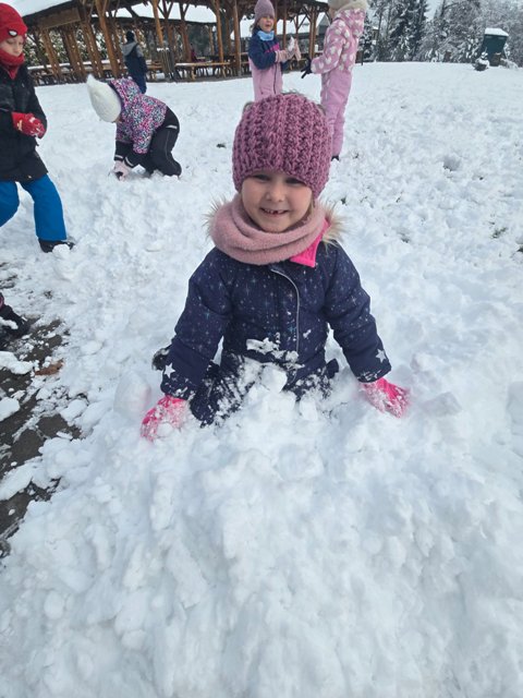 Hurra! Przyszła do nas zima! Trzeba było wykorzystać pogodę i pójść poszaleć w śniegu. Dzieciaczki zrobiły bałwanki, kule i powstała nawet śnieżna gąsienica :) Dużo śniegu i odpowiednie ubranie to przepis na wspaniałą zabawę!
